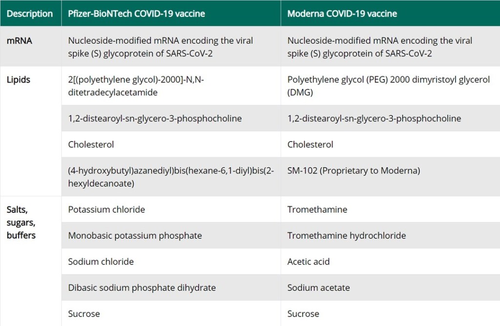 [v] The excipients as listed in Table 1 include salts, buffers, and sugar. The Pfizer/BioNtech vaccine contains four salts including table salt. Moderna vaccine uses tromethamine, an ingredient found in commonly used medications. These ingredients are primarily used to balance pH. Additionally, Moderna vaccine includes acetic acid, the main component of vinegar, and its salt.
