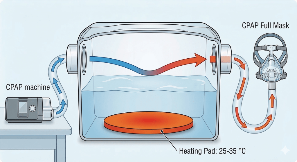 The first is the heated humidifier. In this system, air from the CPAP compressor passes over or through a chamber containing liquid water that is gently heated to a lukewarm temperature, typically 25–35°C, well below the boiling point. Heating increases the air’s capacity to hold water vapor, allowing evaporation to occur. The water is thus incorporated into the airflow exclusively as a gas. In other words, water molecules are a component of the air, no different than oxygen or nitrogen. No liquid droplets are produced, and no visible mist is present. The air delivered through the tubing and mask appears identical to ordinary air, differing only in its higher absolute humidity. This is evaporation-based humidification, analogous in physical principle to environmental humidification of indoor air.