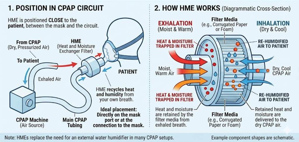 The second is the heat–moisture exchanger (HME). This system contains a porous medium, commonly a matrix or treated fabric, positioned in the airflow pathway. During exhalation, the warm, fully saturated air leaving the lungs deposits heat and moisture onto this medium. During the subsequent inhalation, the stored heat and water vapor are released back into the inspired air. In this configuration, there is no liquid water reservoir and no introduction of new water during use; rather, a portion of the patient’s own exhaled moisture is captured outside the body and returned. The exchanger functions as a temporary storage matrix, moderating humidity loss across respiratory cycles.